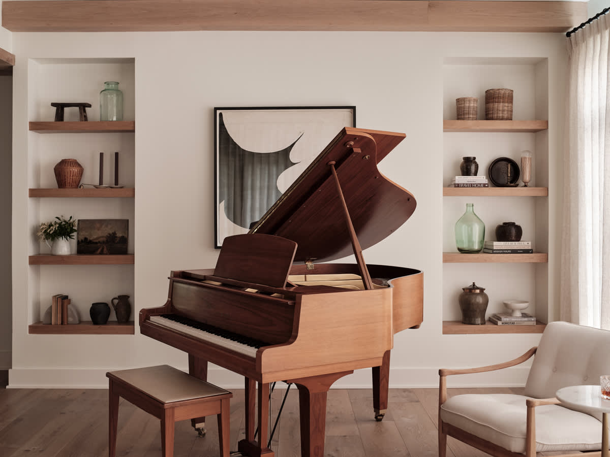 She clad the lower eight-foot portion of the ceiling in white oak planks with perpendicular beams. In the taller portion of the living room, larger wood beams stretch across the ceiling in the opposite direction. This dual approach visually separates the two spaces into a sitting area and a music salon that houses the owner’s piano and her grandmother’s antique grandfather clock.